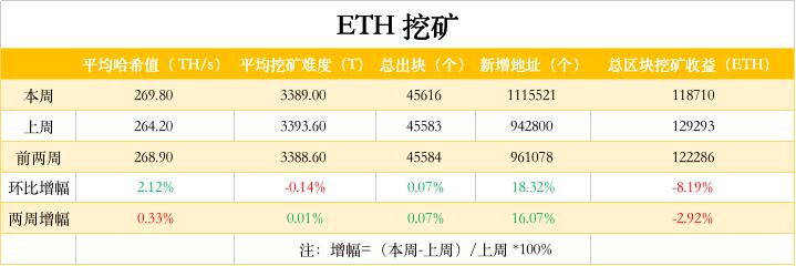 etherchain.org 数据显示,平均算力环比上涨 2.12%,暂报 269.8 TH/s;平均挖矿难度下降 0.14%,暂报 3389 T;挖矿总收入环比下降 8.19%;新增地址环比上涨 18.32%,链上活跃度下降。