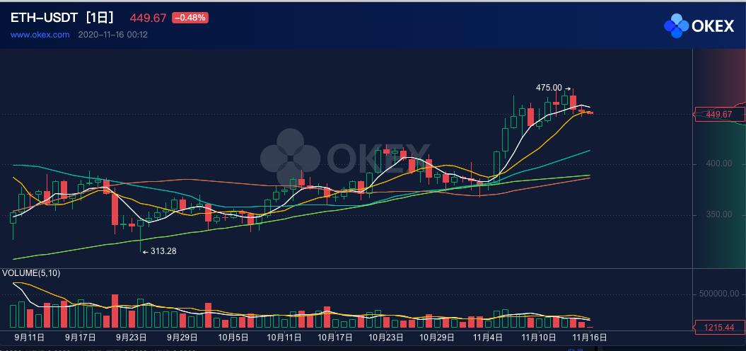 OKEx 行情数据显示,上周 ETH 价格一度上涨至 475 USDT,周内收于 451.86 美元,环比下降 1%。