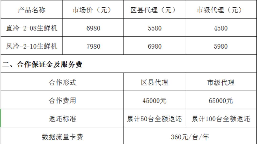 一位生鲜柜硬件销售负责人告诉《灵兽》,机器多为购买,代理商价格一台4580元,而购货商的价格在6580元,且货源供应链需要自行解决。
