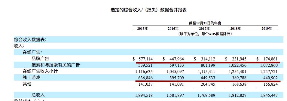 翻查搜狐公布的2015年到2019年的财报,可以看出,搜狐的品牌广告收入逐渐下降,从2015年约5.8亿美元,下降到2019年的1.7亿美元。在线游戏收入同样呈下滑态势,从2015年的逾6.3亿美元,下降到2019年的4.4亿美元。