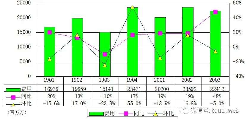 其中,京东2020年第三季度来自Fulfillment的支出为115.92亿元,市场费用为54.6亿元,来自研发的费用为41亿元,来自管理费用为15.96亿元。