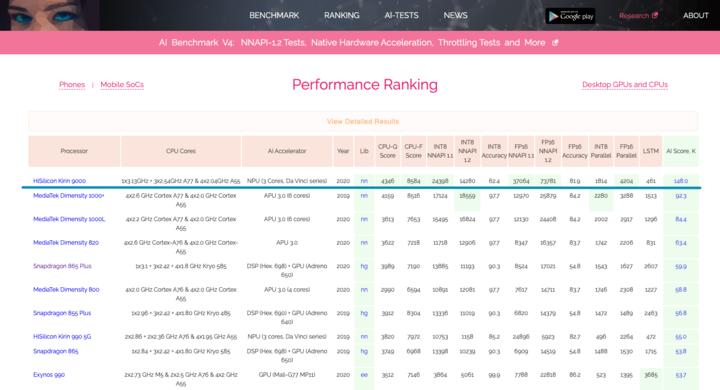 苏黎世联邦理工学院推出的 AI Benchmark 榜单中,麒麟 9000 摘得安卓阵营的桂冠,分数是高通骁龙 865+的两倍多。