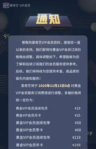 11月6日,爱奇艺方面宣布将于11月13日起,调整平台黄金VIP会员服务价格,调整后定价共分六档,连续包月、月卡、连续包季、季卡、连续包年、年卡分别为,19元、25元、58元、68元、218元和248元。对此,有网友在看到爱奇艺宣布涨价的时间点刚好卡在双11期间后表示质疑,认为所谓涨价是否“另类营销”。甚至还有调侃称,“还不赶紧来买个十年八年年费会员?不买可就要涨价咯。”