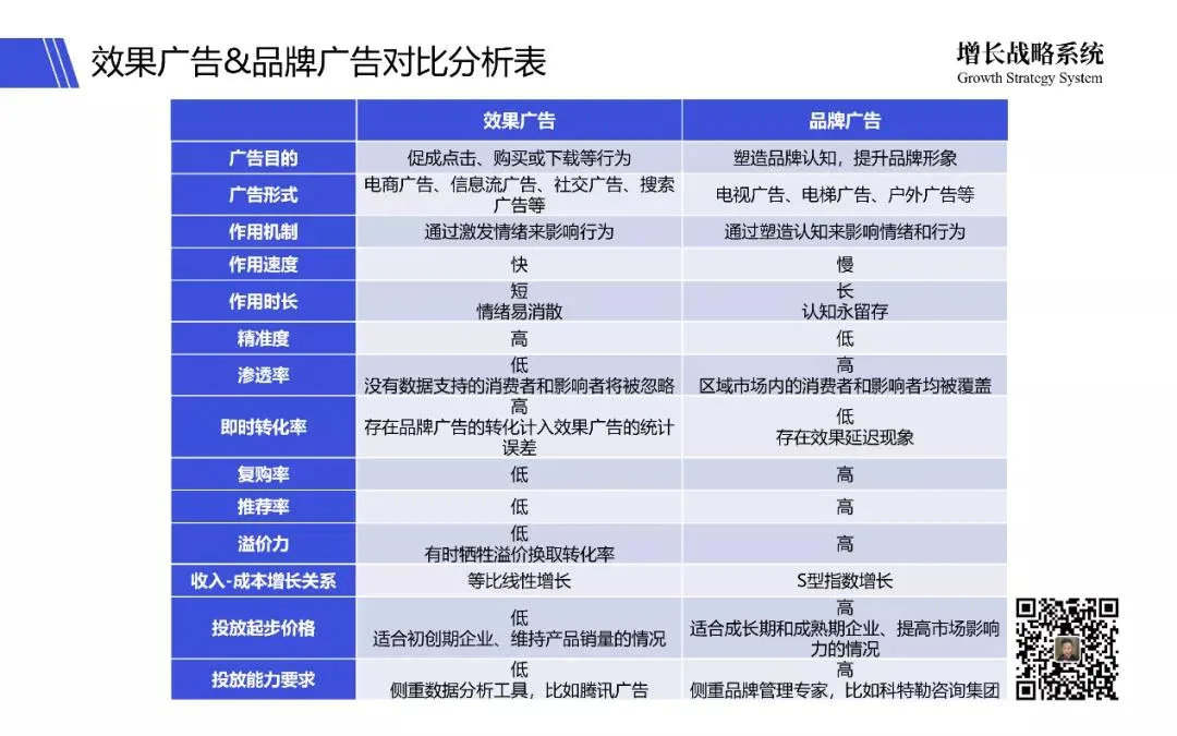 最后,分享一张关于效果广告和品牌广告的对比分析表,祝你有所启发。