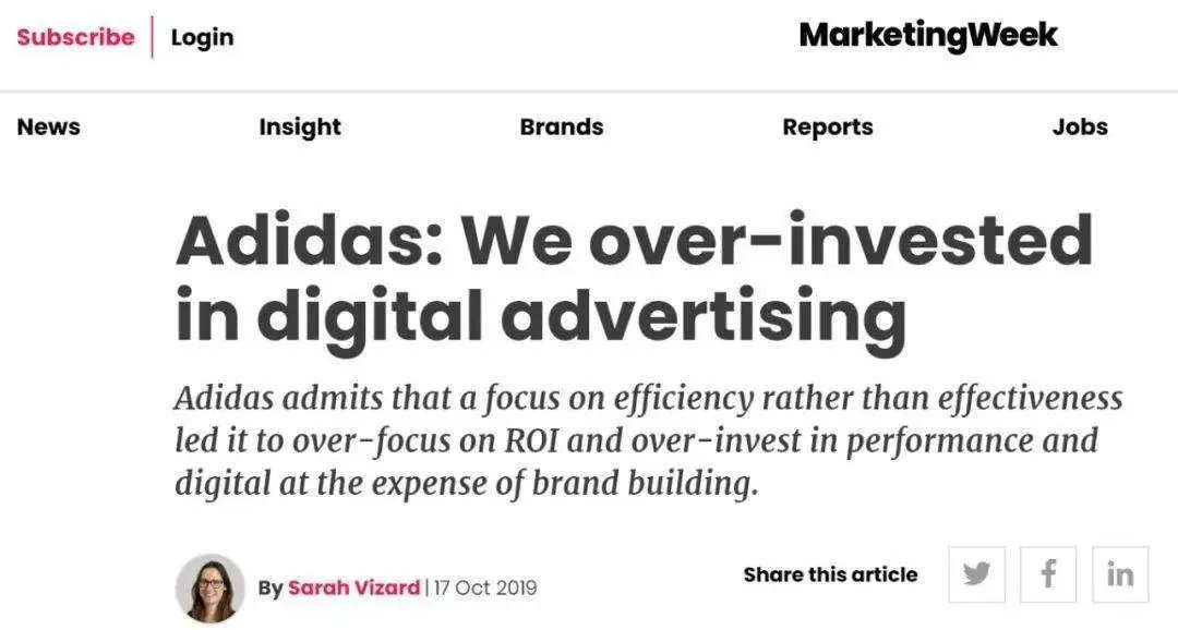2019年,Adidas全球媒介总监说过去一年投资效果广告占比高达77%,导致业绩受损,正是这个原因。