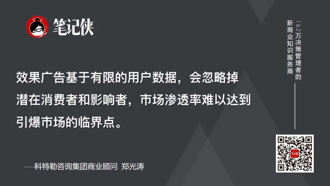 效果广告基于有限的用户数据,会忽略掉潜在消费者和影响者,市场渗透率难以达到引爆市场的临界点。