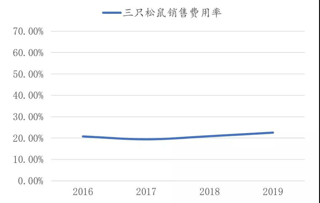 三只松鼠营业收入的增长严格依赖销售费用的增加,形成了20%的比例关系,而且2017-2019年销售费用的增速均高于营收增速。
