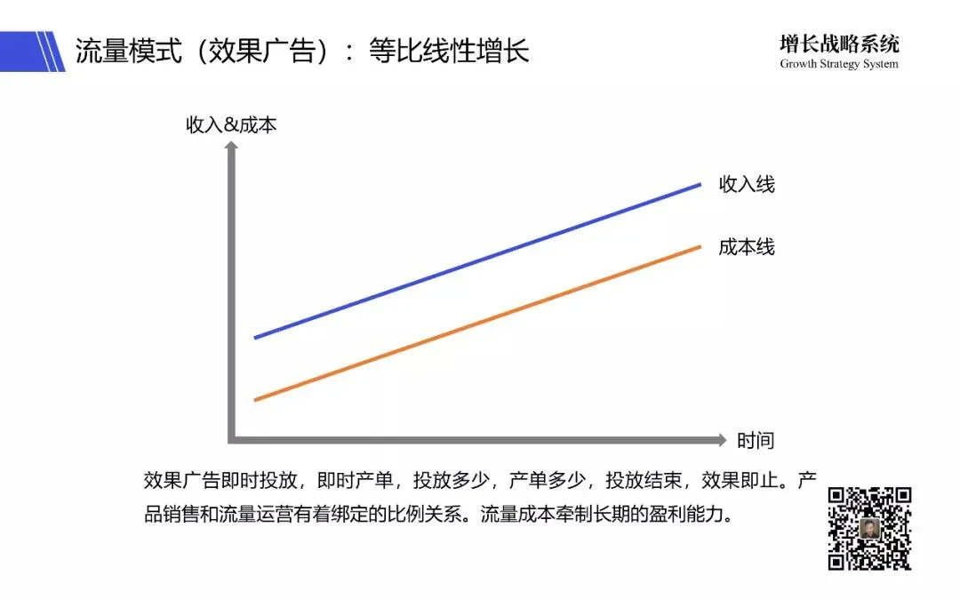 这就是流量模式的增长规律:效果广告即时投放,即时产单,投放多少,产单多少,投放结束,效果即止。产品销售和流量运营有着绑定的比例关系。流量成本牵制长期的盈利能力。
