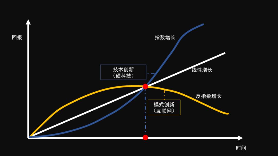 在技术的研发和成长期,科技回报的增长是低于线性增长的,然而一旦过了拐点就是指数型增长,并能够迅速成为支撑经济的支柱。