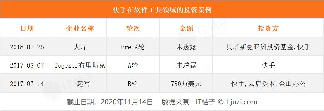 IT 桔子数据显示,2017 年-2018 年快手共计参与了 3 起工具型产品的投资。其最早一起对外公布的投资「一起写」是在快手 2017 年快手 D 轮之后不久。