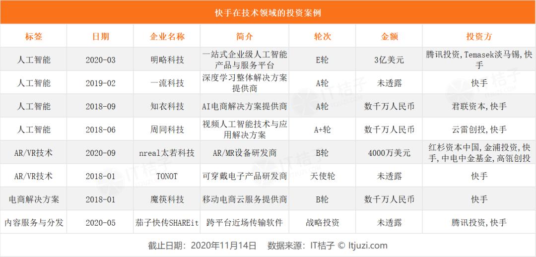 这些企业后来有不少与快手的产生深度合作——如知衣科技,当前知衣科技与多位千万级快手红人合作,促成供应链直播卖货;如明略科技,2020 年在明略科技完成 E 轮融资后表示,将与淡马锡、快手等投资合作伙伴在国际市场拓展、营销智能等方面开展合作;如魔筷科技,在达成投资交易后,2018 年初魔筷正式进入快手平台,为网红的电商交易提供 SaaS 系统。