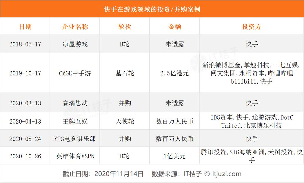 2020 年,快手更是大手笔砸向电竞直播领域,先是在 2020 年 8 月 24 日,快手收购了 YTG 电竞俱乐部,进军王者荣耀职业联赛,推出更多的游戏电竞内容。10 月 26 日快手又参与投资了电竞运营商英雄体育 VSPN 的 B 轮——这家公司当前已经与国内 70% 及海外 50% 顶级电竞运动赛事达成深度合作,累计承办逾万场职业电竞赛事,每年制作播出总时长达 12000 小时的视频内容。