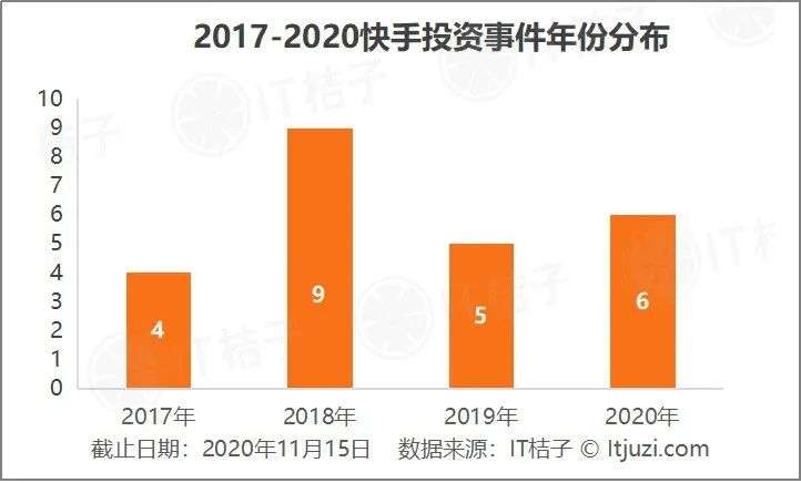IT 桔子数据显示,当前快手已公开的对外投资有 29 起,所投公司领域涉及人工智能、教育、游戏、企业服务等;在投资节奏分布上,快手的投资最早出现在 2017 年,2018 年是快手投资最活跃的时期,后续 2019 年至今,快手的投资一直保持一定的活跃度。
