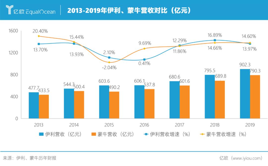 2019年,蒙牛实现营收790.3亿元,伊利营收为902.2亿元,超蒙牛近100亿元。