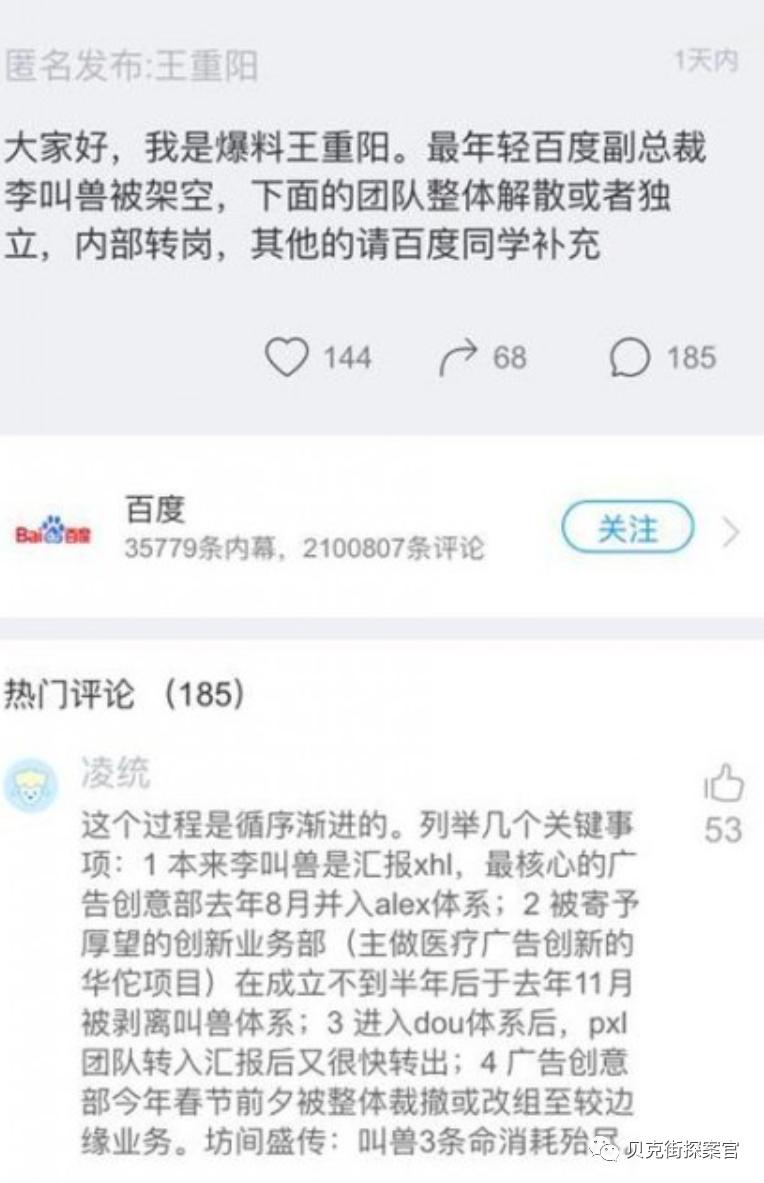 仅仅一年后,2018年初,网络有传言,百度史上最年轻副总裁李叫兽被架空。李叫兽团队负责的多项业务被剥离,不再由李叫兽负责。