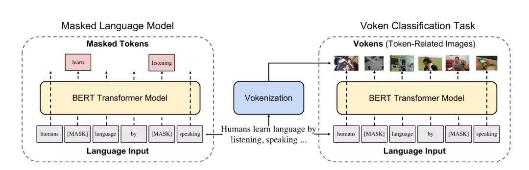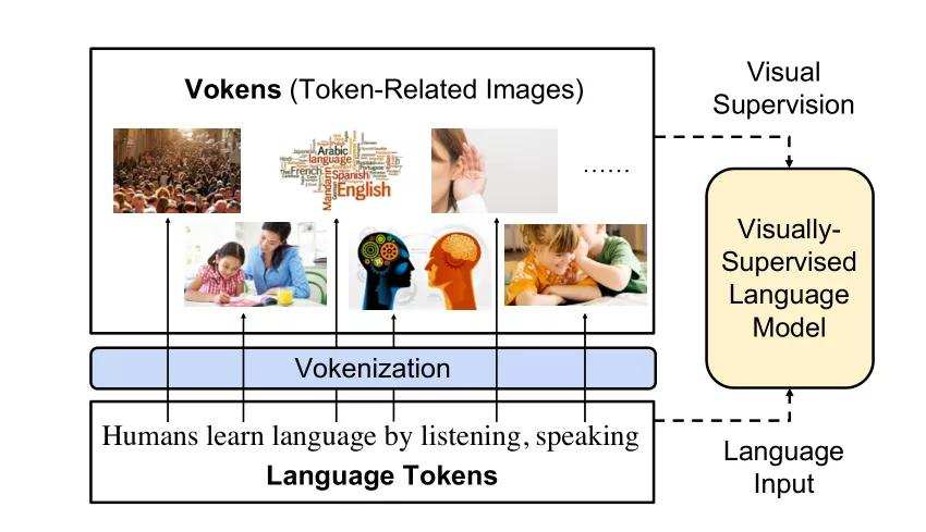 一般来看,自然语言中的词汇中很大一部分是没有视觉特征的,这为视觉监督提出了主要的挑战。我们知道,在AI训练语言模型中的单词被称之为Token(标记),而研究人员则把视觉语言模型中与每个Token相关的图像称之为Voken。而Vokenizer就代表为一个Token寻找一个Voken的算法,Vokenization就代表整个算法模型实现的过程。