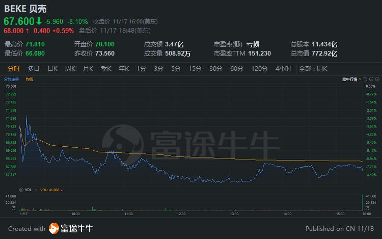 上市以来股价一路上涨的$贝壳(BEKE.US)$周二收盘大跌8.1%。贝壳最新股价为67.6美元,上市以来股价累计上涨237%。