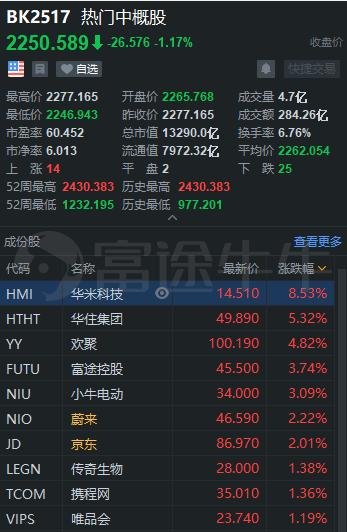 大型中概股中,阿里巴巴跌0.58%;百度跌2.65%;京东涨2.01%;网易跌0.29%;拼多多跌6.8%;趣头条跌2.45%;蔚来涨2.22%;爱奇艺跌14.62%;迅雷涨6.9%;欢聚时代涨4.82%;虎牙涨0.6%;华住涨超5%、盘中创新高。