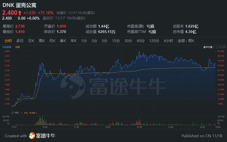 蛋壳公寓17日小幅高开,盘中大幅拉升,随后高位震荡;截至收盘,蛋壳公寓暴涨75.18%,领涨中概股。在此之前,蛋壳公寓经历了近三个月的回调。在8月26日至11月16日,蛋壳公寓股价从8.15美元一路跌至1.37美元,期间跌幅达83.19%。