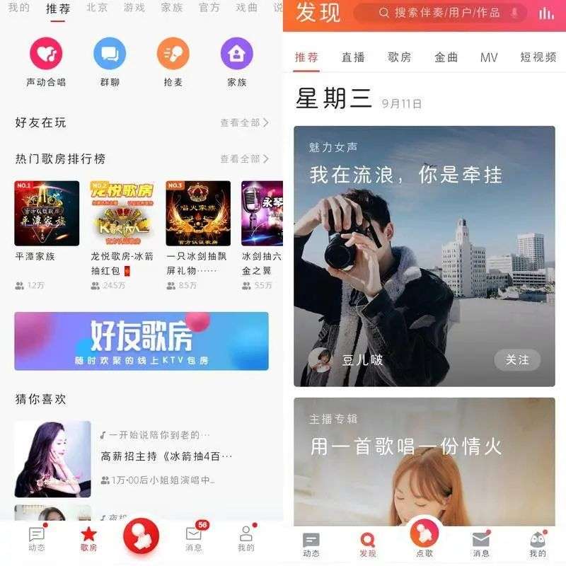现在的全民K歌VS两年前的全民K歌。图片来自于作者截图。