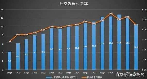 在衡量付费用户氪金能力的ARPPU值上,社交娱乐业务在今年前两个季度都有所下滑,直到第三季度才出现了一定的回升。此外,社交娱乐用户付费率今年以来也频频滑落,三季度的付费率仅为4.5%,低于去年同期的4.9%,也不及一季度的5.0%和二季度的5.3%。