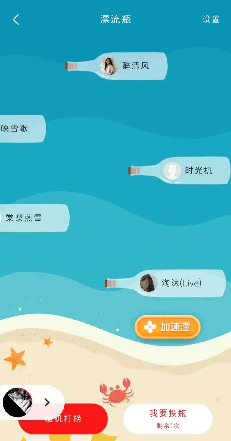 全民K歌的漂流瓶功能。图片来自于作者的截图。