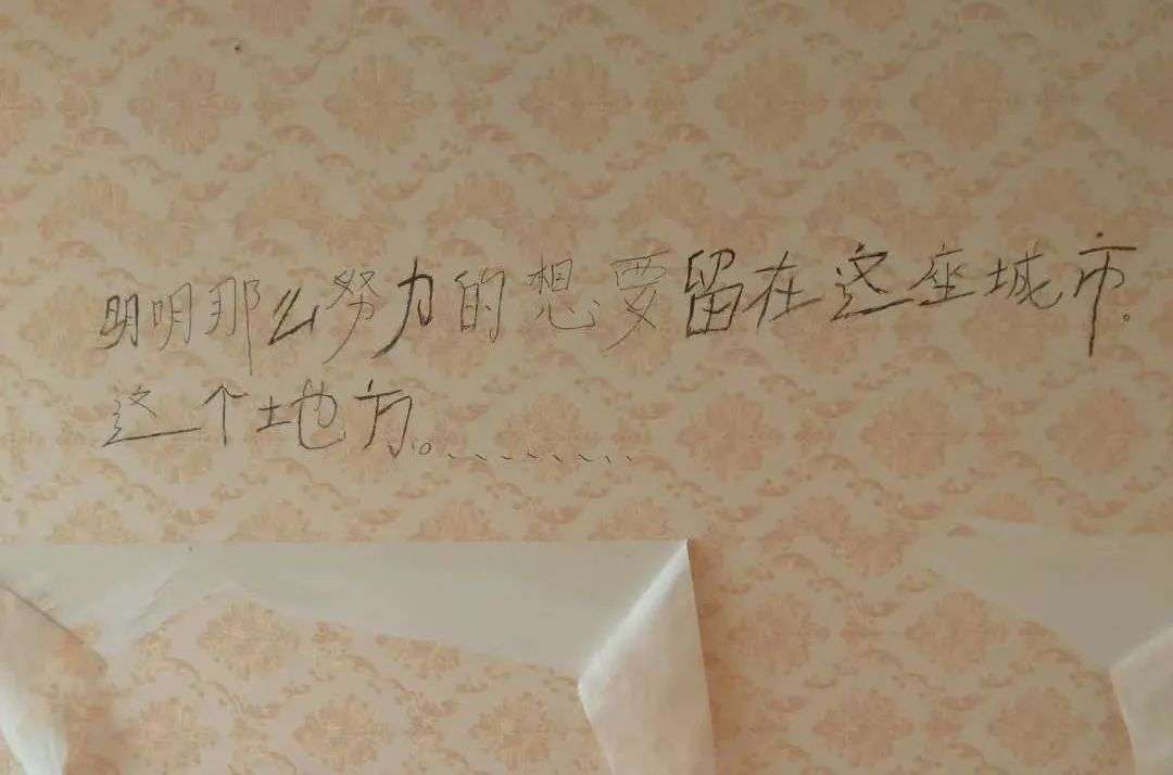 ↑ 2018年3月,罗福兴关掉理发店前,在撕破的墙纸上留下的话