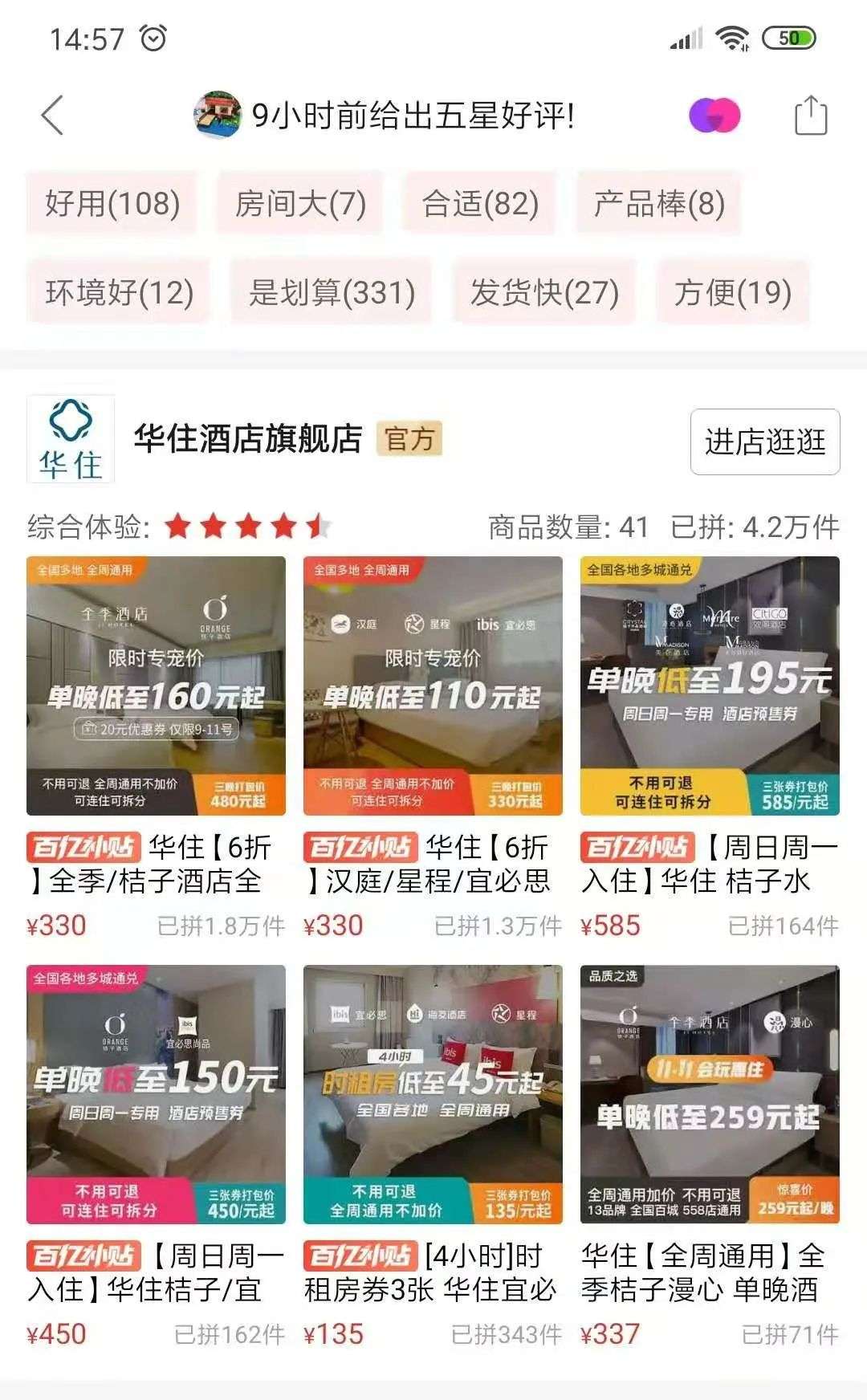 华住旗下另有两款类似产品——漫心/美居/桔子水晶全球49+酒店3晚通兑,以及海友/怡莱酒店全国600+门店3晚通兑,售价分别为630元、270元,后者并未参与“百亿补贴”活动,但两者销量截至目前也都达到了2000多件。