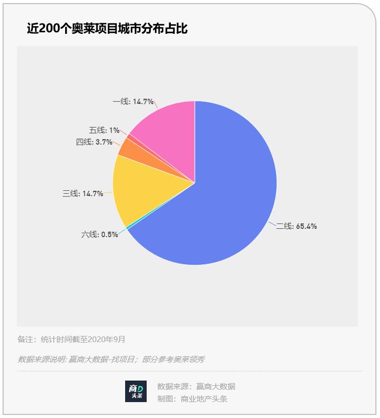 商业地产头条整理的近200个奥莱项目中,94.8%落在一二三线城市。其中,二线城市占比高达65.4%。(数据来源:赢商大数据-找项目;部分参考奥莱领秀)