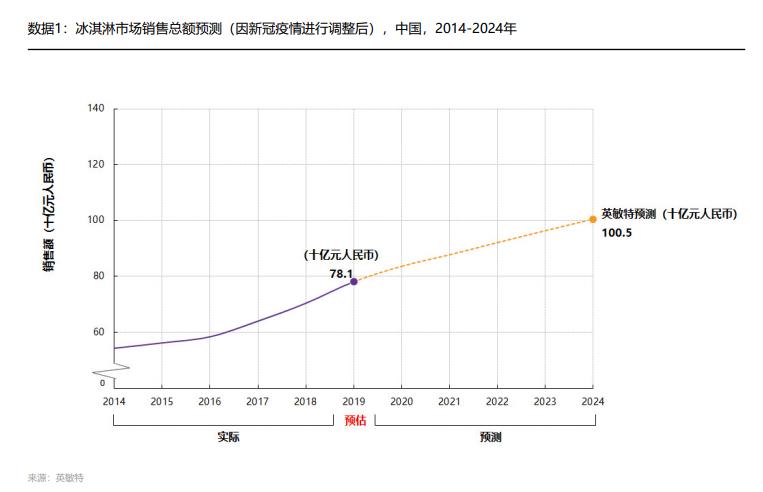 目前,中国冰淇淋市场规模已近千亿。英敏特预计,中国冰淇淋市场2020年销售额规模将超过800亿人民币,并在2024年突破1000亿人民币。