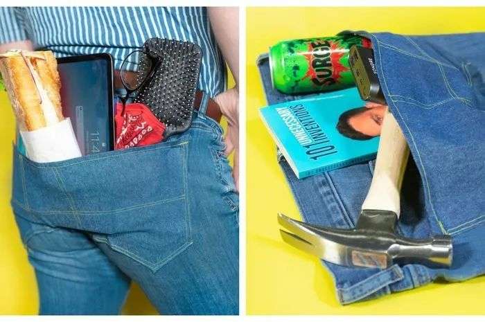 再比如用餐拉帘(Cuisine Curtain),只要往鼻子一挂,就能将用餐者的嘴巴完全遮挡起来,实现用餐过程的私密化。再来看看单口袋牛仔裤(Solo Stash Pants),作为对于那些总在埋怨裤子口袋不够大的声音的回应,贝尼代托在牛仔裤的屁股后设计了一个超级巨大的口袋,足以装得下一台笔记本电脑。