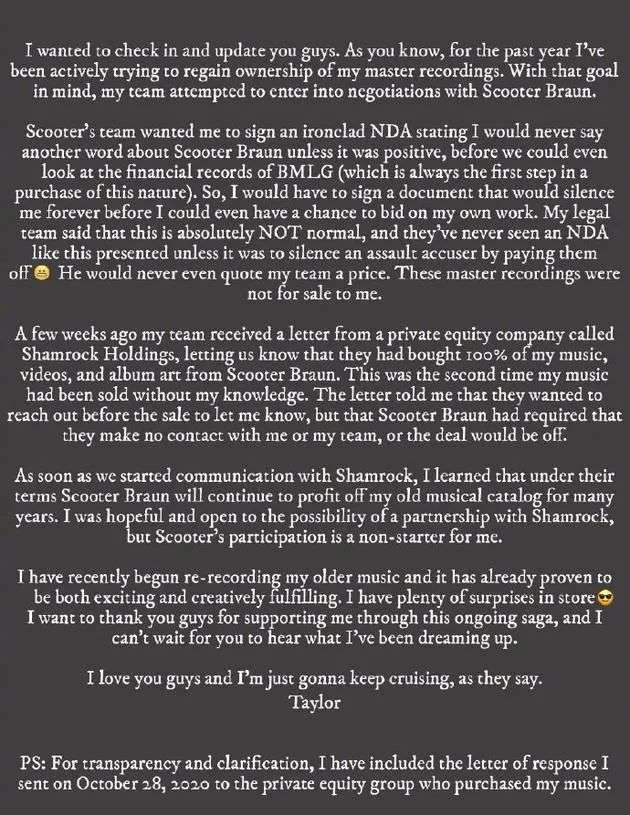 交易完成后,Shamrock于第一时间联系了Taylor Swift。双方本一直在积极探讨开展合作的可能性,直到Taylor发现Scooter Braun能够于此次交易后仍持续从自己的旧专辑中获利。在10月28日发给Shamrock的信件中,她表示:"我们目前无法成为伙伴......让我与十年来创作的音乐保持分离非常痛苦,但这是必须做出的牺牲。"