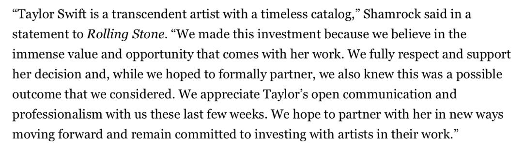 另一方面,雄厚的资本也带来了相当的话语权,而这也将对行业产生巨大的影响力。例如在本次交易中,尽管被要求不得与Taylor产生任何沟通以免影响交易,但Shamrock仍然秉着希望未来能够建立合作的初衷主动联系上这位巨星,颇有诚意地进行了交流,并在一份致《Rolling Stone》的声明中高度赞扬了其所具备的艺术价值:"我们之所以进行这项投资,是因为相信她的作品会带来巨大价值和机遇。我们完全尊重并支持她的决定......感谢她与我们之间保持的透明沟通和专业素养。"并表示将继续寻求与Taylor Swift合作的方式。