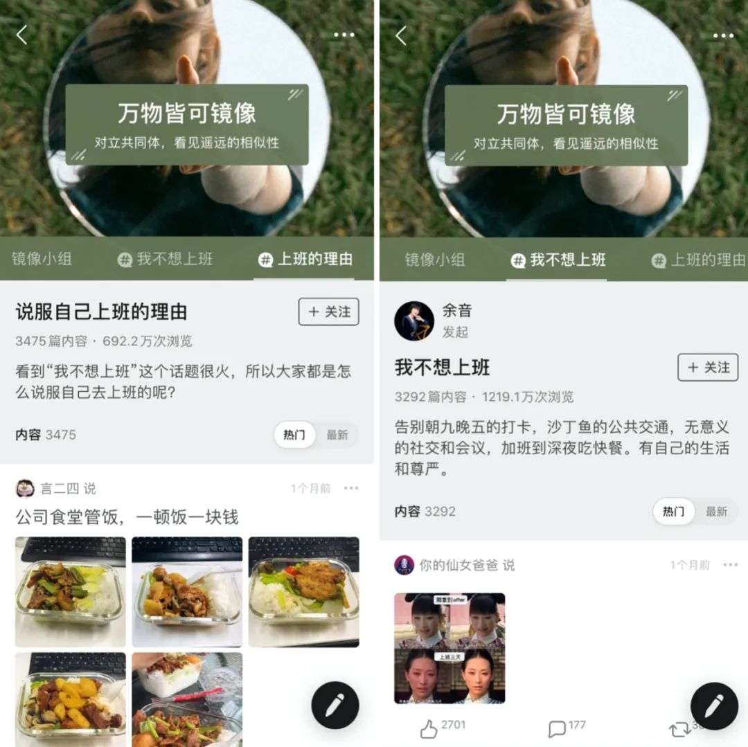 没多久又有一个镜像话题与原话题关联了起来,叫“说服自己上班的理由”。