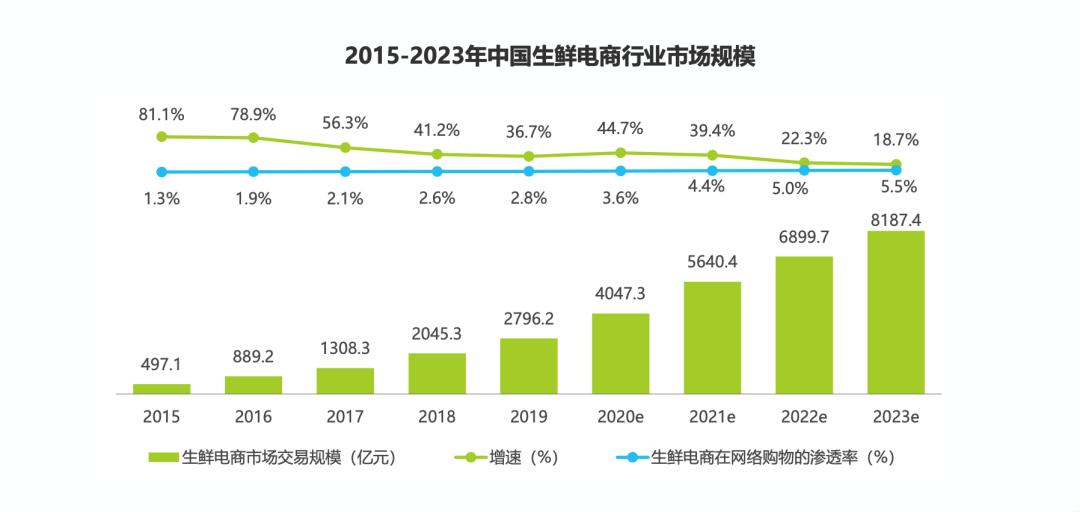 ▲2015-2023年中国生鲜电商行业市场规模,来源于艾瑞咨询