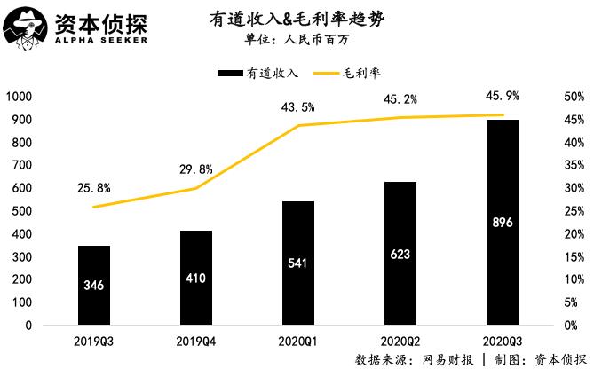具体而言,网易有道在三季度取得净收入8.96亿元,同比增长159%,这也是有道上市以来的最快增速。得益于规模效应和教师薪酬结构的优化,有道的毛利率达到45.9%,较上一季度的45.2%进一步提高。
