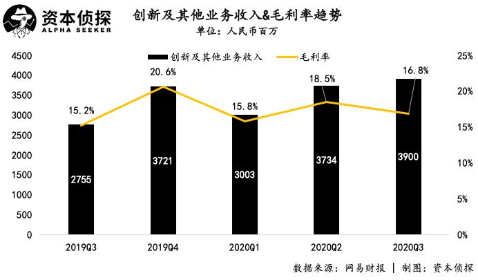 和有道一样,网易的创新及其他业务收入增速同样高于整体增速,该项业务在三季度取得净收入39亿元,同比增长41.6%。