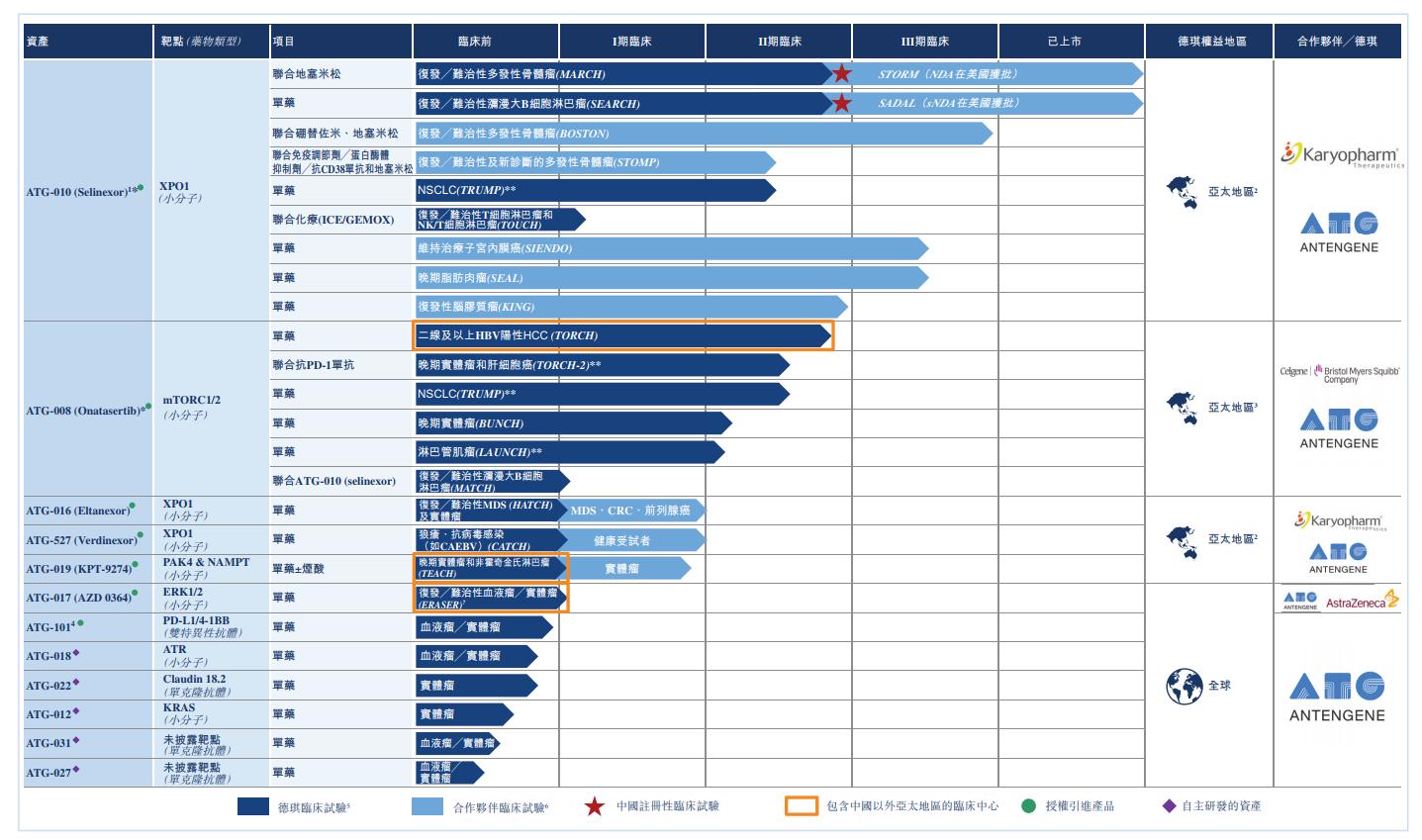其中,核心产品之一ATG-010 (selinexor,美国商品名XPOVIO®),是全球同类首款及同类唯一的选择性核输出蛋白抑制剂(SINE),可促使肿瘤抑制蛋白在细胞核内积累,选择性诱导癌细胞凋亡。该产品已获美国FDA批准用于治疗复发难治性多发性骨髓瘤(RRMM)及弥漫性大B细胞淋巴瘤(RR DLBCL)患者的治疗,且中国尚无其他任何用于多发性骨髓瘤治疗的XPO1抑制剂正处于临床开发中。目前,「德琪医药」正在中国进行ATG-010 (selinexor)治疗复发难治性多发性骨髓瘤和复发难治性弥漫大B细胞淋巴瘤的二期注册临床试验,并计划于2021年之前在中国大陆、中国香港、中国台湾、澳大利亚、新加坡、韩国及泰国提交ATG-010 (selinexor)的新药上市申请。