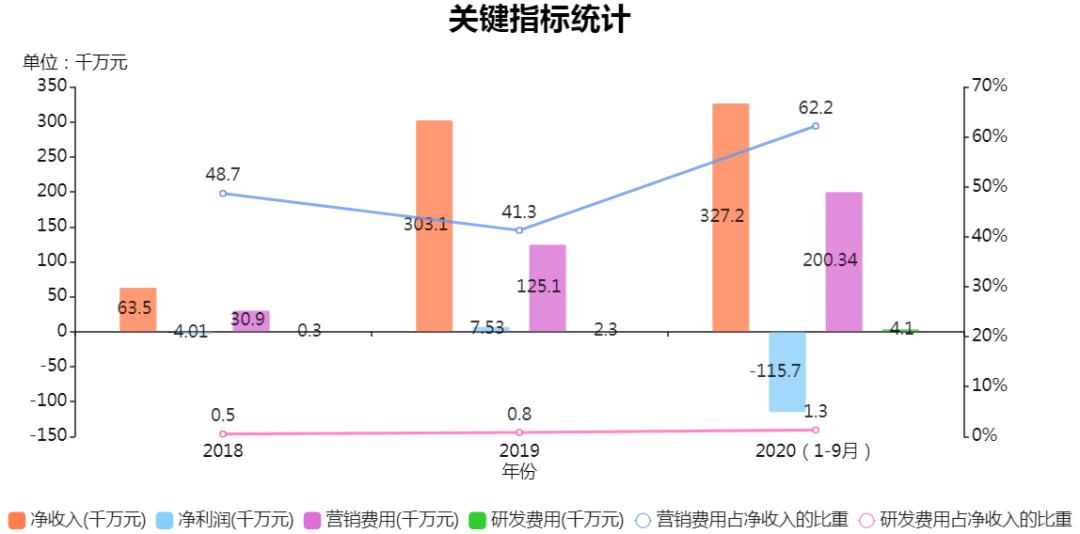 与瑞幸相仿,完美日记的市场份额也是靠钱烧出来的。根据招股书披露,2018年至2020年前九个月逸仙电商的净收入从6.35亿元持续增长至32.72亿元,但是相对应的净利润的走势相当曲折——2018年亏损4012.4万元后,2019年盈利7535.9万元,2020年前九个月巨亏11.57亿元。高额的营销费用,是大幅亏损的主要原因。