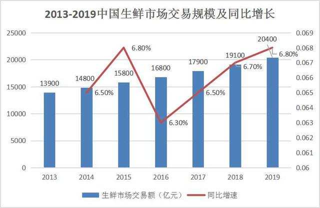 据艾媒咨询数据显示,2013-2019年中国生鲜市场交易规模持续扩大,2019年中国生鲜市场交易规模达2.04万亿,同比增长6.8%。可见在零售市场,生鲜行业的发展潜力不容小觑。