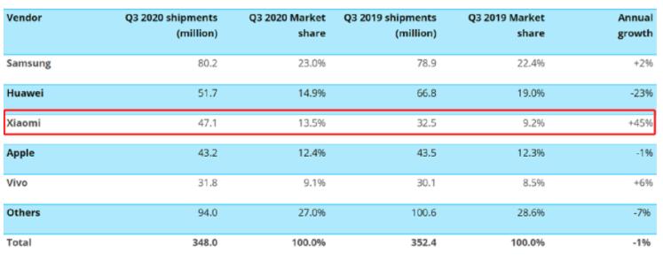 据 Canalys 的报告,在 2020 年第三季度,小米挤进全球智能手机市场前三,同比增长 45%,占据 13.5% 份额。