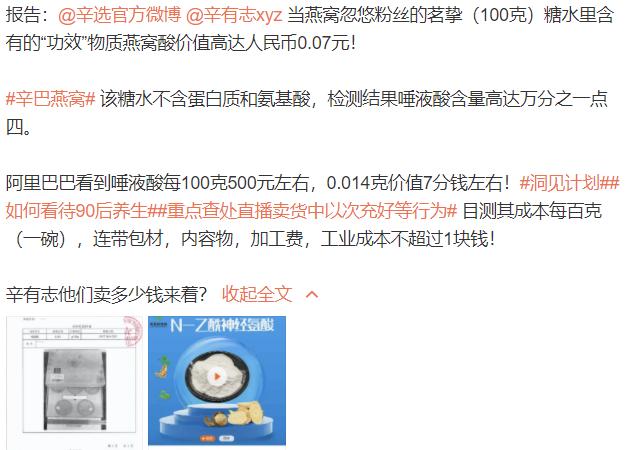 同时,这位打假斗士在微博称,含燕窝饮料、含燕窝方便粥、含燕窝糖水皆智商税。根据他的估算,“辛巴燕窝”工业成本不会超过1元钱,但其在辛巴团队直播间的售价超过40元。
