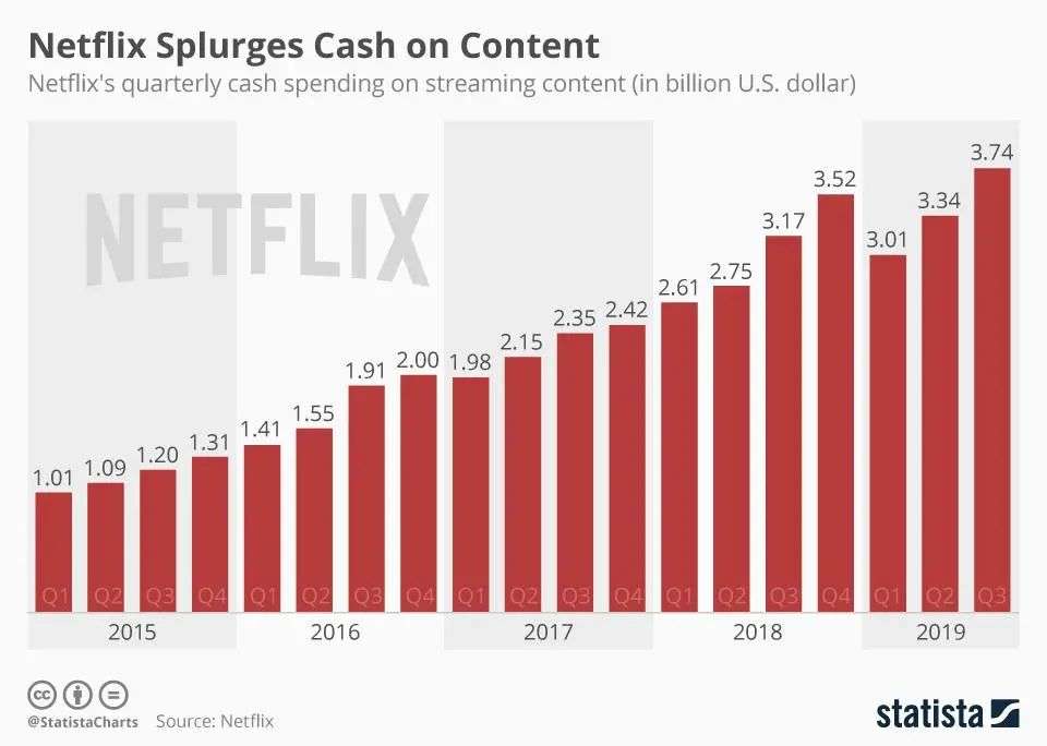 但Netflix的营收神话,同样是建立在高成本投入的基础上的,2019年每季度,Netflix的内容投入都达到了30亿美元,换算下来就是一年700亿人民币。高投入也体现到了收费上,相较于HBO、迪士尼等传媒推出的流媒体业务,Netflix的订阅起步价就来到了每月9美元,在东南亚国家也要7美元。