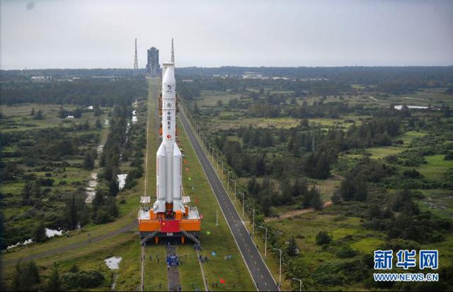 ▲长征五号遥五运载火箭垂直转运至发射区 来源:新华社