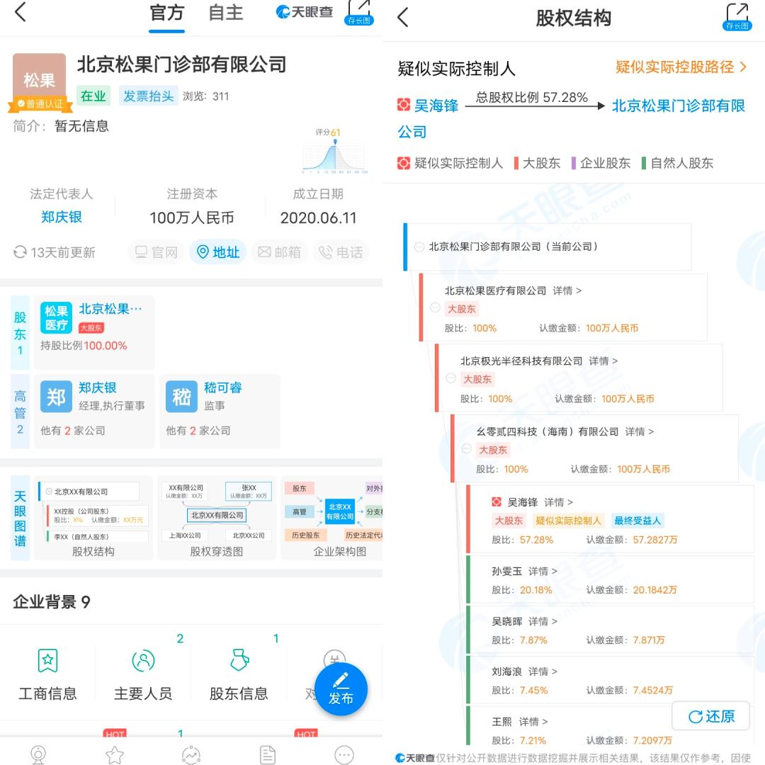 据天眼查显示,松果门诊的主体为北京松果门诊部有限公司,成立于今年6月,隶属于幺零贰四科技(海南)有限公司,疑似实际控制人为吴海锋,现为字节跳动互联网医疗业务负责人。