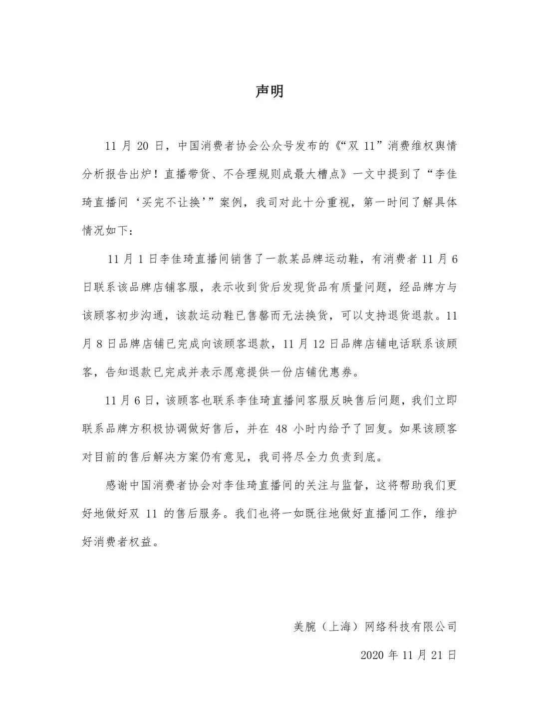 11月20日,中消协发布“双11”消费维权舆情分析报告,通过相关消费维权情况进行网络大数据舆情分析,发现今年“双11”促销期间消费负面信息主要集中在直播带货、不合理规则两个方面,并点名汪涵、李雪琴直播带货“翻车”和李佳琦直播间“买完不让换”等现象。