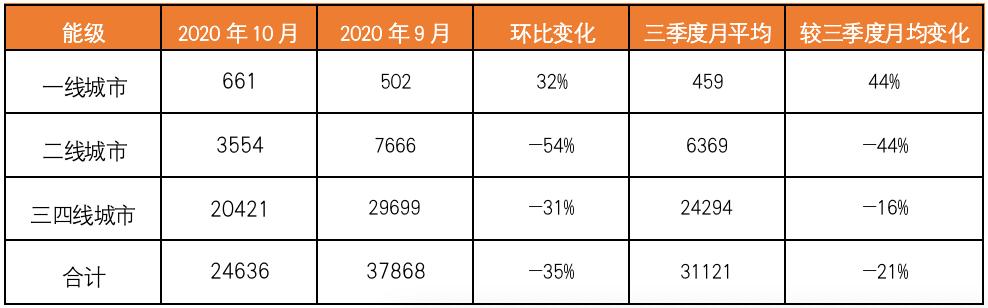 表:2020年10月各能级城市土地供应变化情况(万平方米)