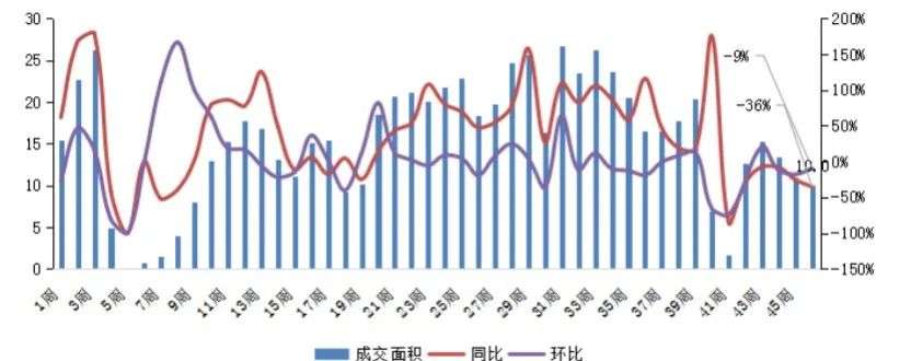 截止11月15日,深圳二手住房周成交面积同、环比齐跌,成交体量回落至10万平方米,环比跌9%,同比跌36%。新政后二手住房市场需求大幅缩量,预计后续市场规模短期内仍将低位调整。