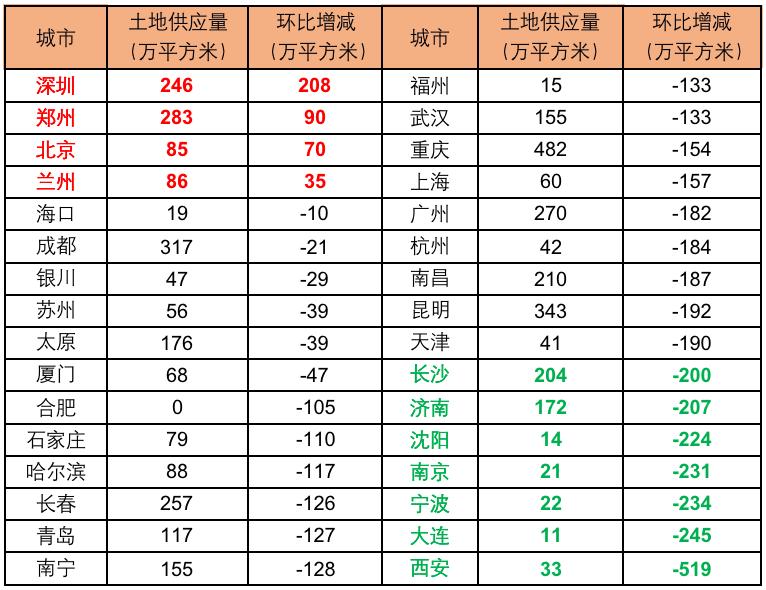 注:考虑到各城市土地成交规模变动较大,实际规模变化更能直观反映供应量的变动,故在上表中不显示环比变动。