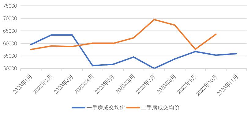 一手房方面,均价受市场及政策更为明显,2020年6月在疫后恢复阶段曾出现过一个小高峰,随后受政策影响跌入全年最低谷,为50011元/平方米,随后再缓慢恢复。